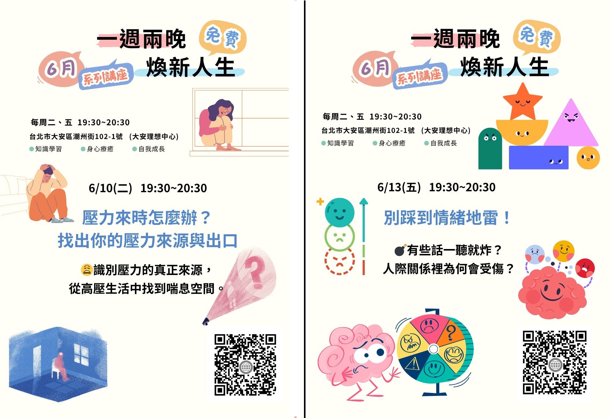 免費系列講座 一週兩晚,煥新人生 知識學習身心療癒自我成長台北市大安區潮州街102-1號 【壓力來時怎麼辦?找……(繼續閱讀)