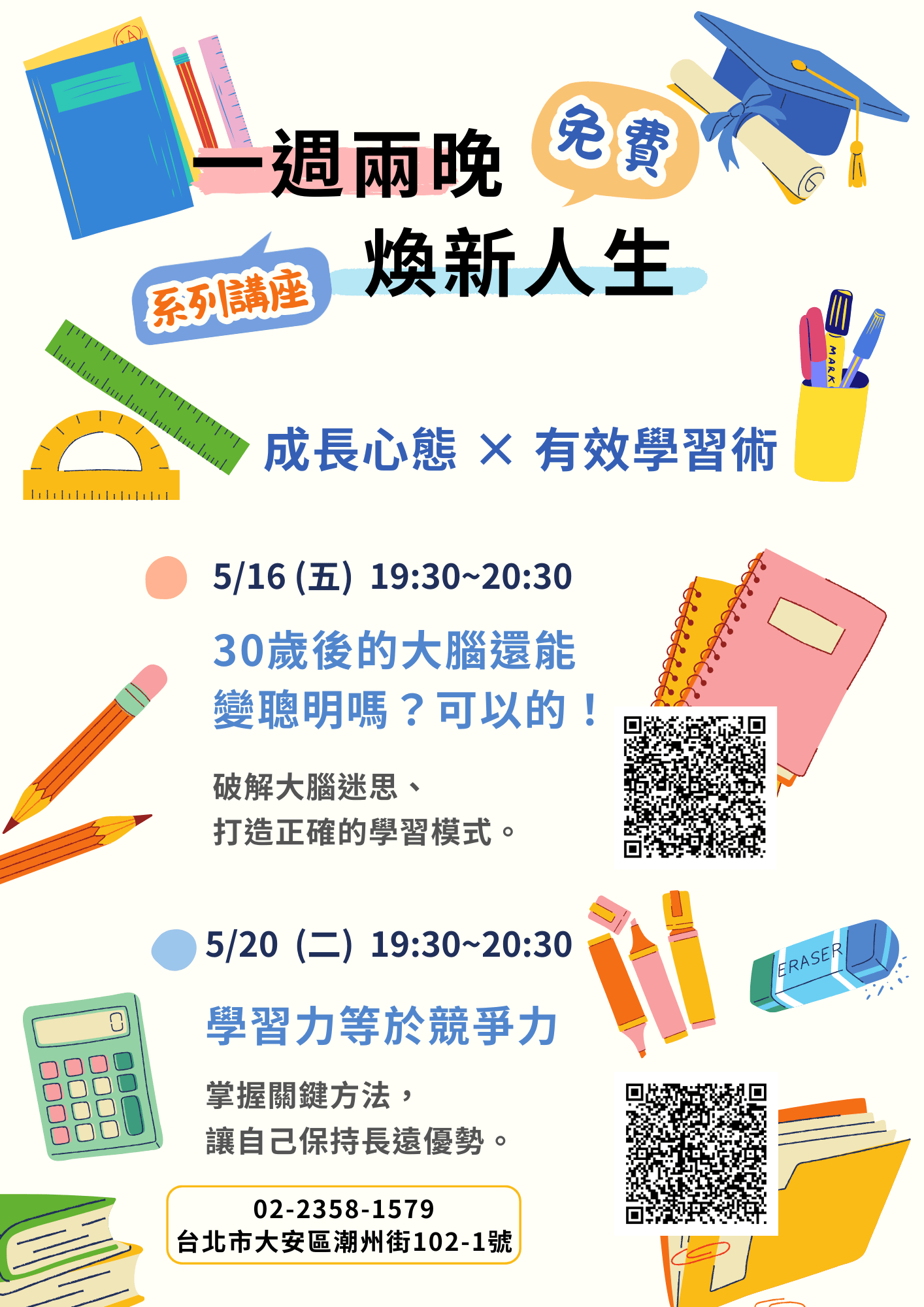 廣受好評的🌛一週兩晚,煥新人生✨免費系列講座🥂來到第三週了!這次的主題是📈成長心態 × 有效學習術📚 💡5/1……(繼續閱讀)